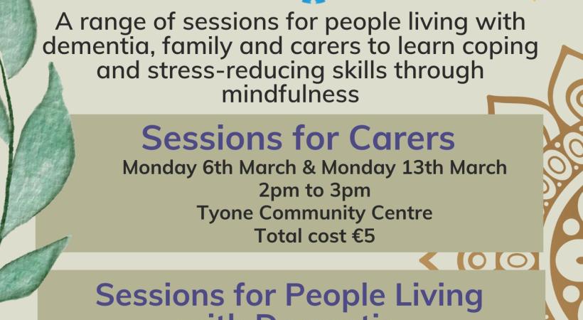 Silver Arch Family Resource Centre Health and Wellbeing Programme are delighted to bring a series of Mindfulness Sessions to support people living with dementia, and their families and carers for the month of March. This is being delivered by Neil Dennehy of Health Matters, and aims to offer coping and stress-reducing skills through mindfulness. We have broken down these sessions into two parts: • Monday 6th March and Monday 13th March from 2pm to 3pm is for family and carers of people living with dementia only, and takes place in Tyone Community Centre, Nenagh. Cost is €5 per person for both sessions. • Monday 20th March and Monday 27th March from 2pm to 3pm is for people living with dementia and their family member or carer. Cost is €5 per person for both sessions. We also will be running mindfulness sessions for anyone living with dementia, family members and carers on-line every Wednesday for the month of March, from 7pm to 8pm to facilitate people that cannot make it in person. Places are limited and can book booked through reception of Silver Arch FRC at 067-31800.
