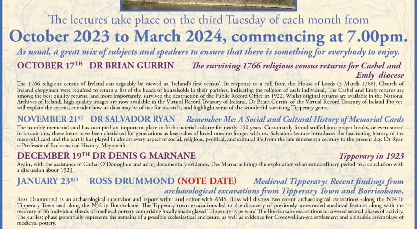 The 1766 religious census can arguably be viewed as 'Ireland's first census'. In response to a call from the House of Lords Church of Ireland clergymen were required to return a list of householders in their parishes, including the religion of each individual. The Cashel and Emly returns survived the infamous fire in 1922 and are considered some of the best quality returns. In his lecture Dr Brian Gurrin will explain the census, consider how its data may be used for research, and highlight some of the wonderful surviving Tipperary gems. Digitised copies of the returns are now available in the Virtual Record Treasury of Ireland.