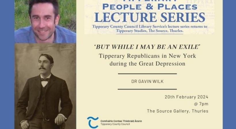 Tipperary People and Places Lecture Series: February 2024 Join us in The Source Library, Thurles on Tuesday 20th February at 7 pm for Gavin Wilk’s lecture ‘But while I may be an Exile’ : Tipperary Republicans in New York during the Great Depression. Gavin will examine the lives of Tipperary republicans who emigrated to New York after the Irish revolution and will specifically look at their lives during the Great Depression of the 1930s. Using a variety of resources, he will describe how these men and women worked, socialised and survived during the turbulent era and also talk on the transatlantic links that existed and provided support for them. Gavin works in University of Limerick. For further information contact Tipperary Studies 0526166123 or email studies@tipperarycoco.ie. All welcome and admission free.